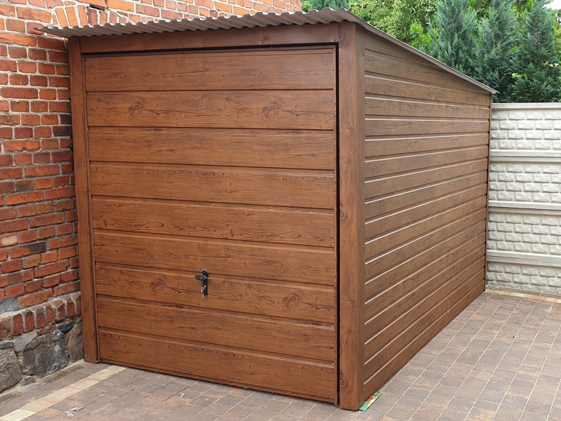 Nasz garaż 2×3 m. pokryty jest powlekaną blachą trapezową imitującą drewno. Blacha powlekana charakteryzuje się zwiększoną odpornością na warunki atmosferyczne oraz promieniowanie UV. Tym samym garaż nadaje się do eksploatacji przez okres wielu lat, w czasie których będzie wystawiony na oddziaływania pogodowe.