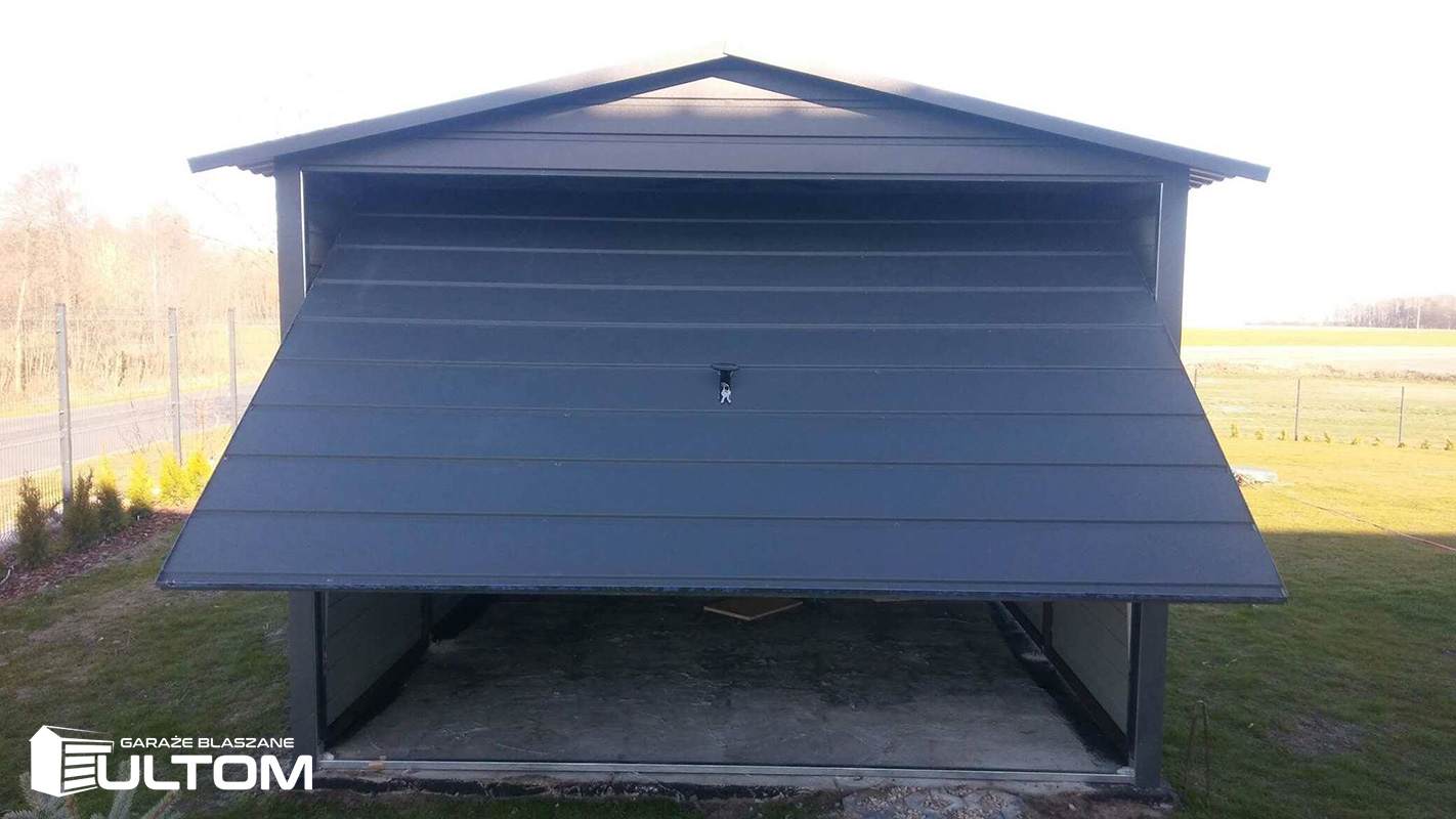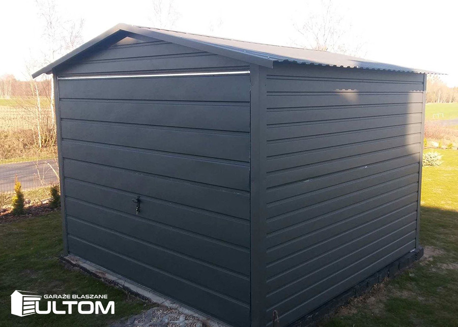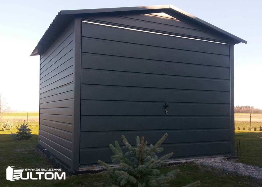 Garaż pokryty jest powlekaną blachą trapezową w kolorze grafitowym (RAL 7016), która charakteryzuje się zwiększoną odpornością na warunki atmosferyczne oraz promienie UV. Bogaty wybór kolorów z palety RAL umożliwia dostosowanie kolorystyki garażu do otoczenia oraz istniejących zabudowań.