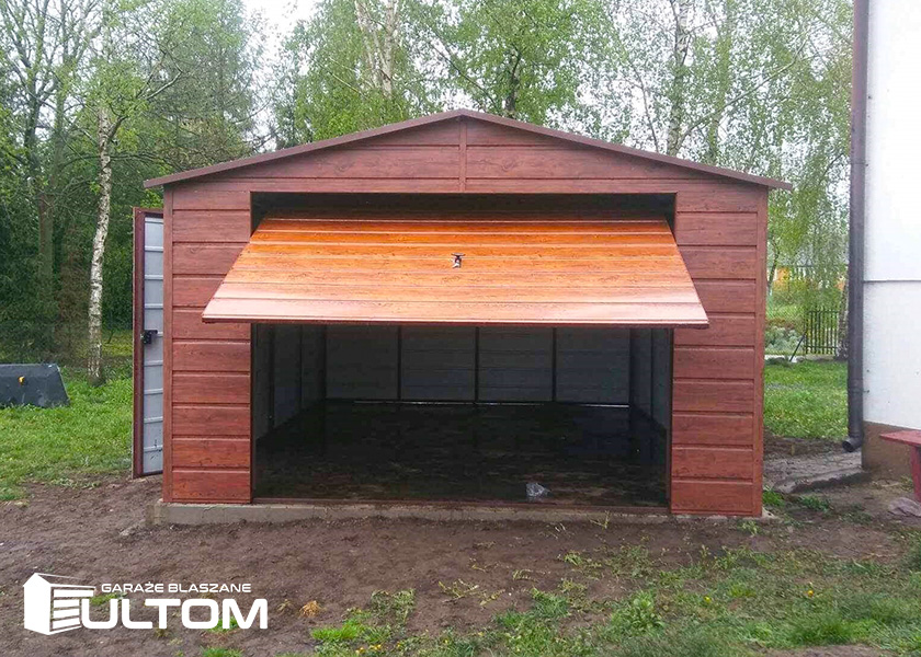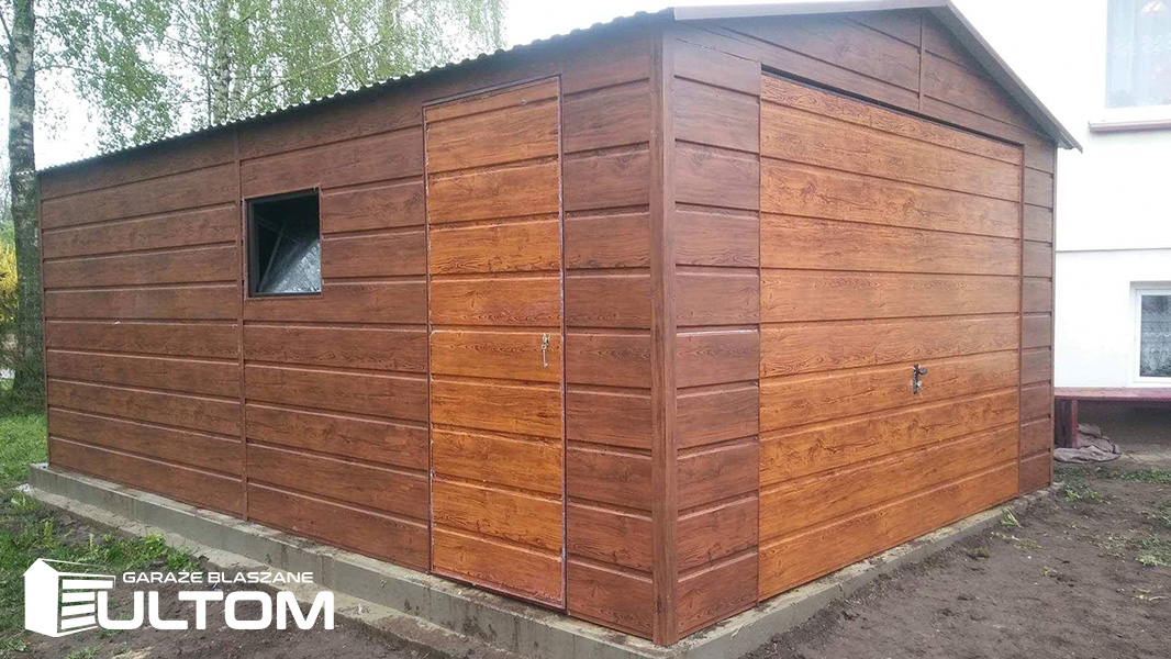 Garaż blaszany drewnopodobny o wymiarach podstawy 4m x 5m z dachem dwuspadowym.