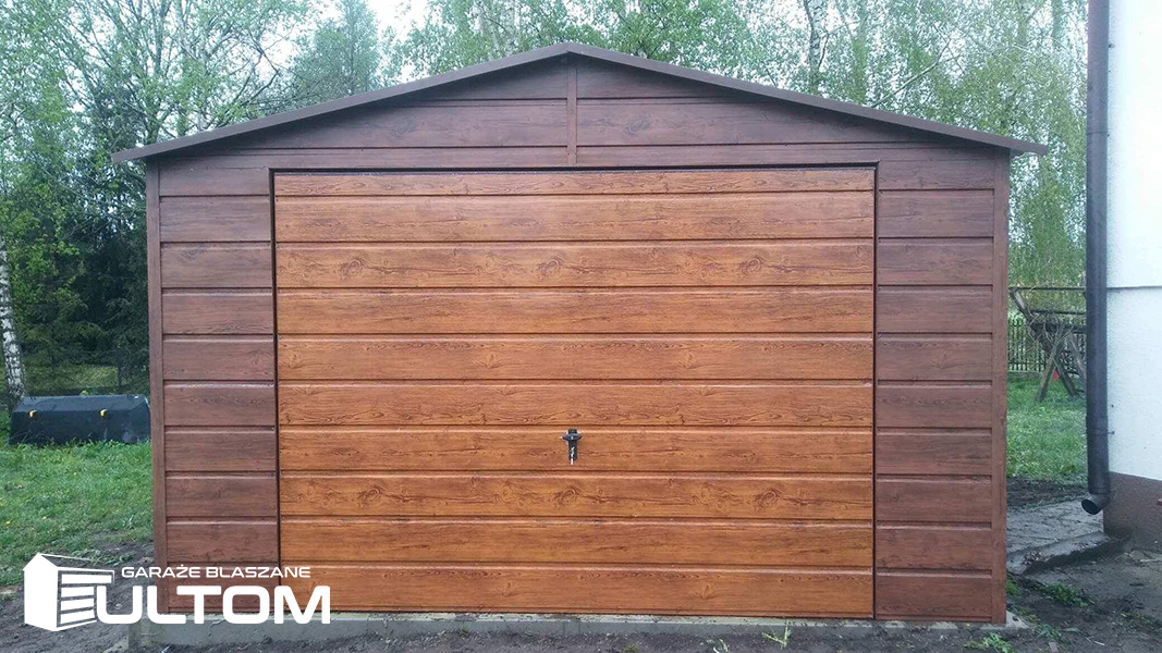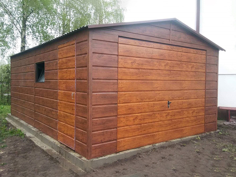Garaż pokryty jest powlekaną blachą trapezową imitującą drewno. UWAGA – szeroki poziomy trapez na całym garażu.