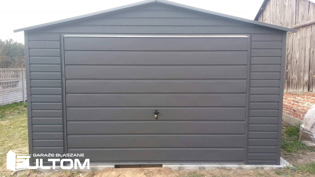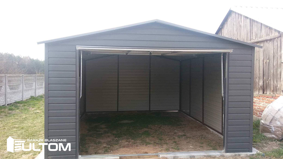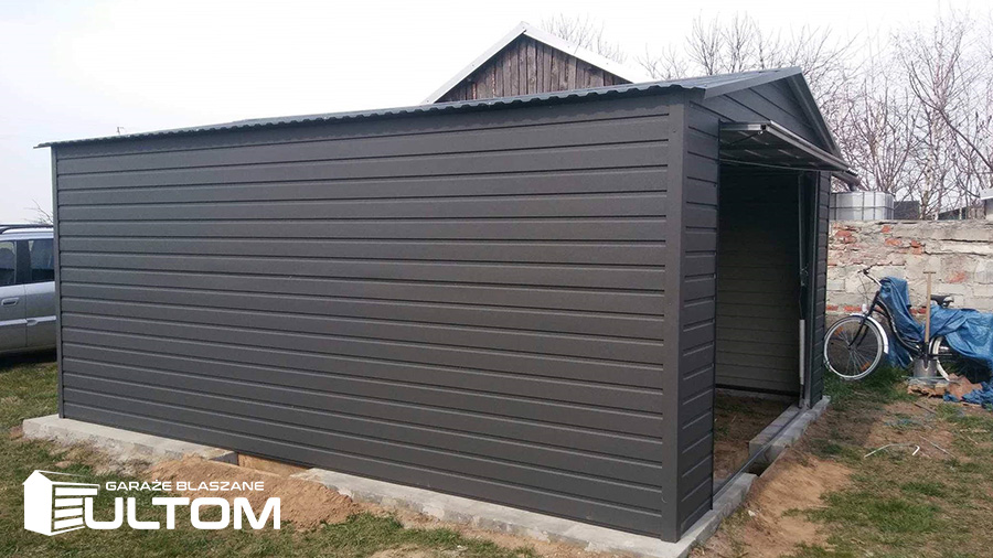 Garaż blaszany o wymiarach 4m x 5m z dachem dwuspadowym.
