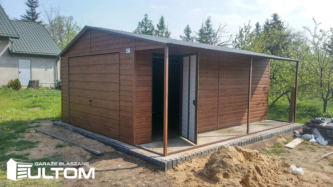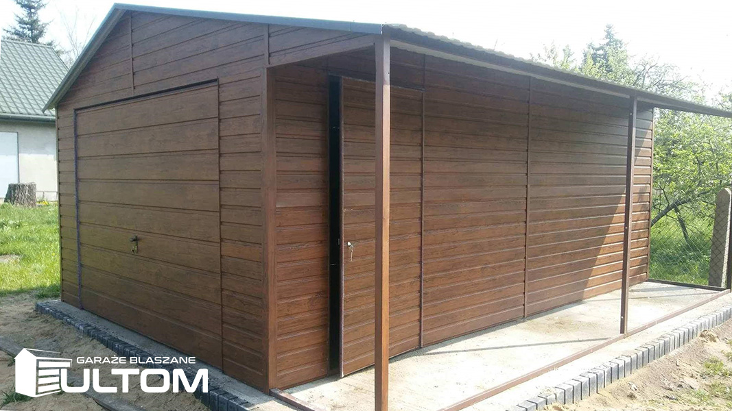 Garaż blaszany drewnopodobny o wymiarach 4m x 5m z dachem dwuspadowym i boczną wiatą o wymiarach 1m x 5m. Funkcjonalna konstrukcja, z zalet której z pewnością skorzystają właściciele domów jednorodzinnych oraz działek rekreacyjnych. Garaż blaszany z wiatą oferuje dodatkową zadaszoną przestrzeń, w ramach której możemy przechowywać meble ogrodowe lub sprzęt sportowy.